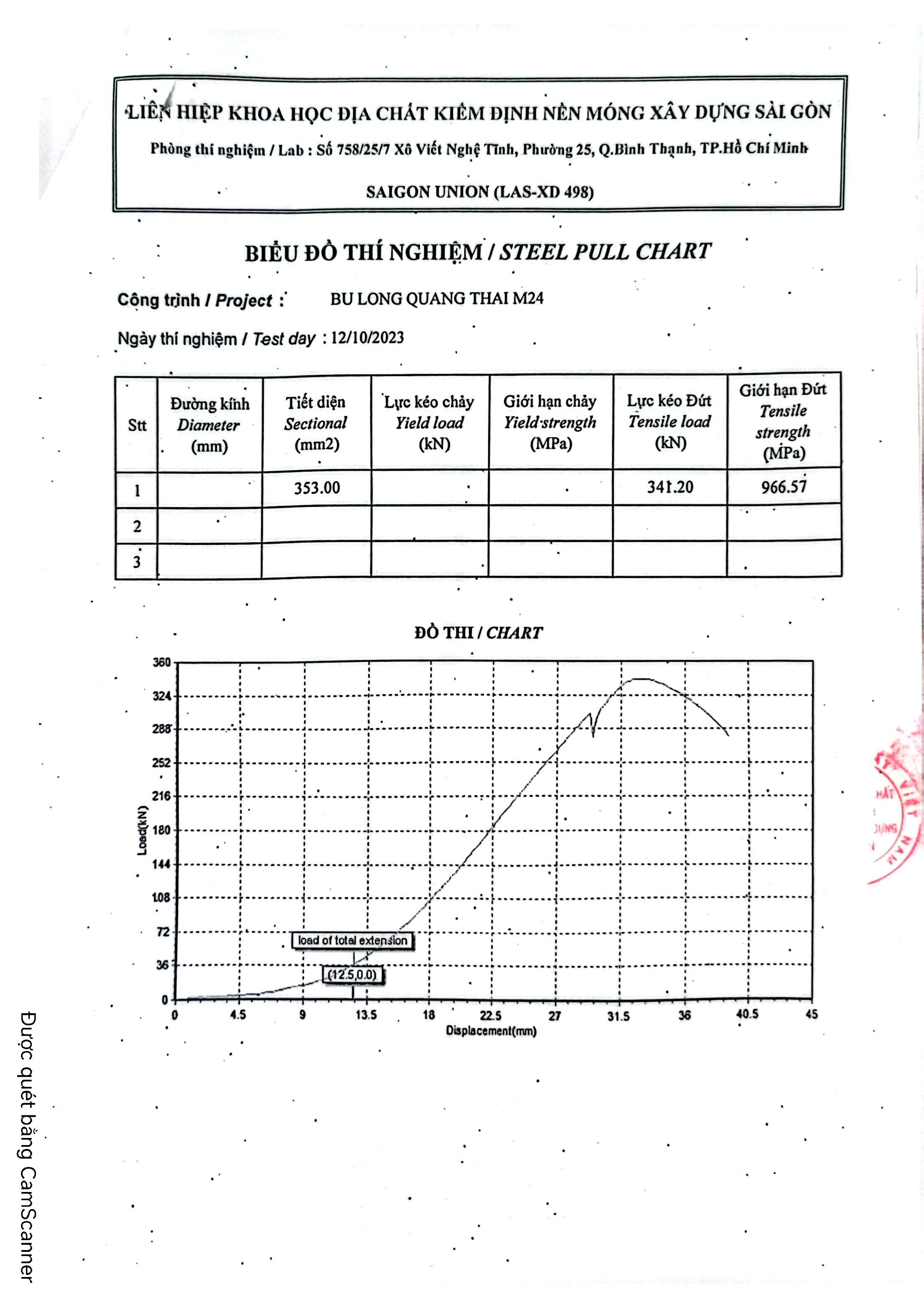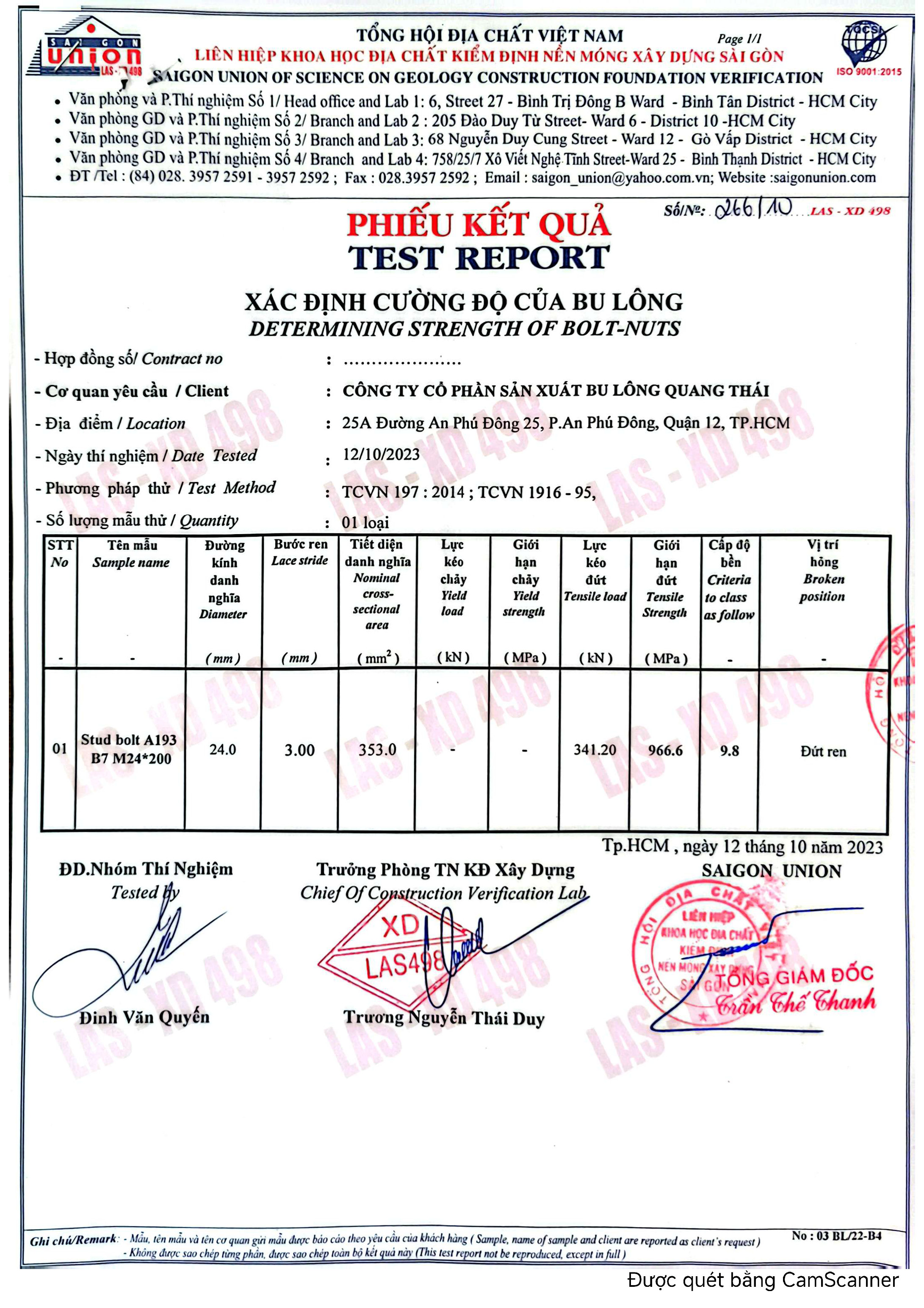 KẾT QUẢ TEST STUD BOLT ASTM A193 B7 M24x200 tại trung tâm